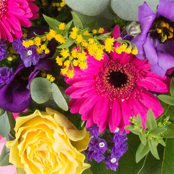 Send a splash of colour with this bright and cheerful cerise, gold and purple hand-tied bouquet.