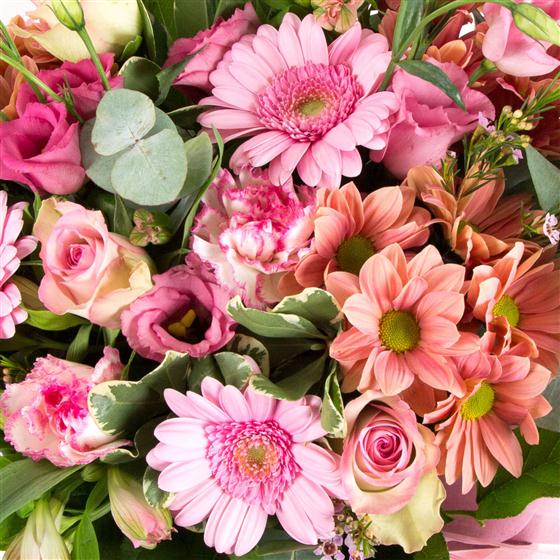 A baby pink hand-tied bouquet of roses, gerberas, alstromeria, wax flower and carnations.