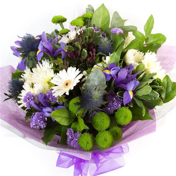 Vibrant limes and purples create a zesty combination of flowers and foliage including alstromeria, carnations, thistles and chrysanthemums.
