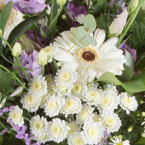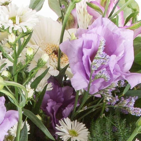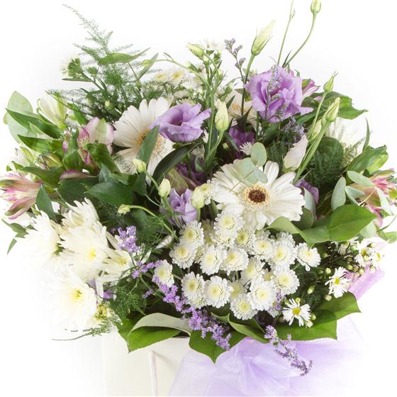 A crisp looking hand-tied bouquet of white and lilac blooms mixed with foliage.